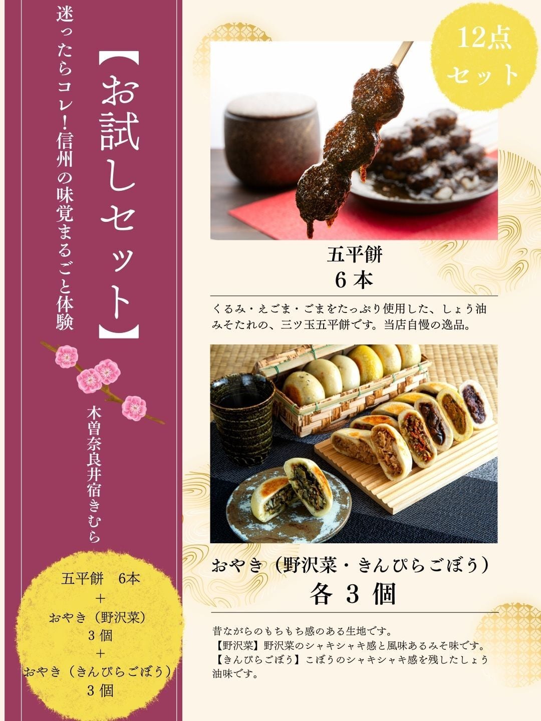 お買い得!迷ったらコレ!【お試し12点セット】 【送料・クール代 計1,550円込】 五平餅6本+おやき(野沢菜)3個+おやき(きんぴらごぼう)3個